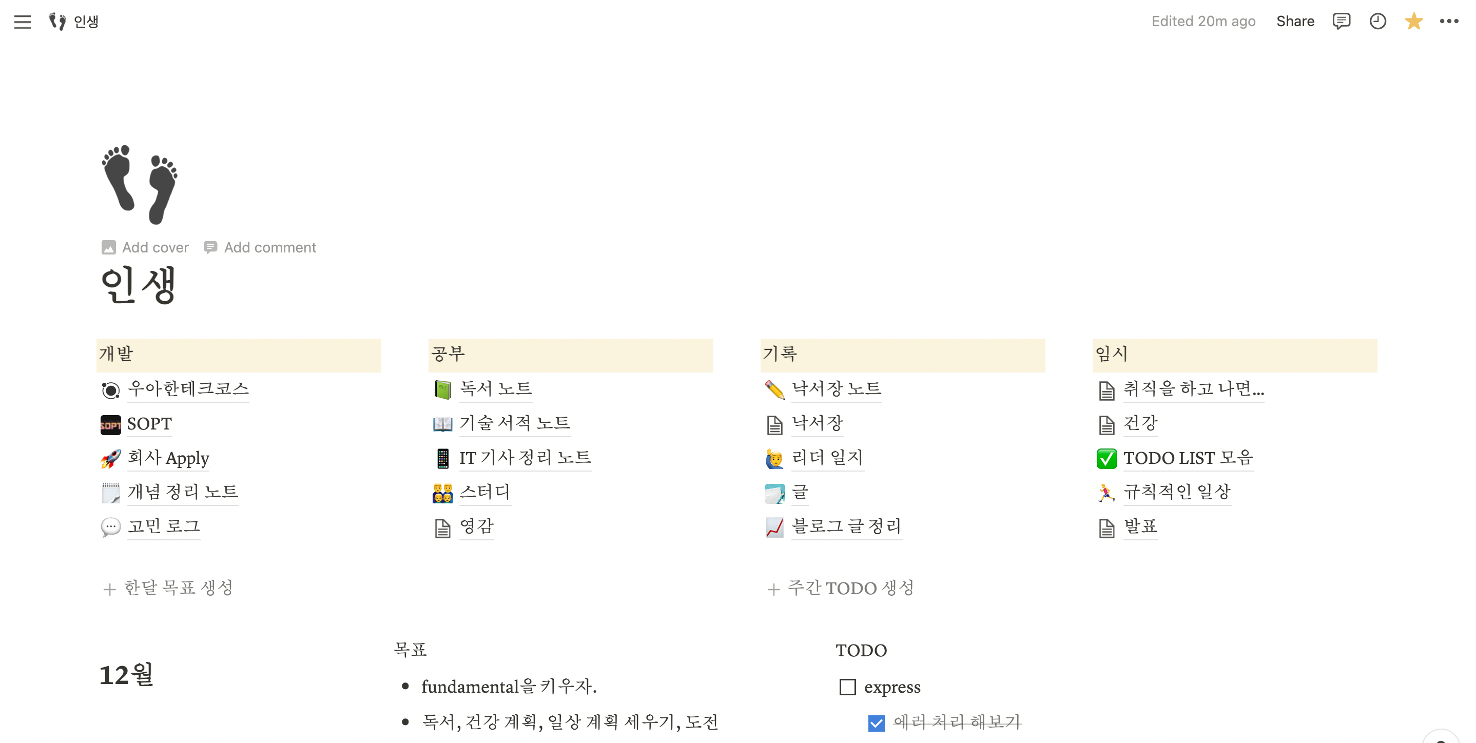 페이지를 하나로 합치고, 한눈에 볼 수 있도록 카테고리를 나누었다. 앞으로 꾸준히 확장성 있고, 잘 응집/분리되도록 노션을 리팩터링(?) 해나갈 예정이다.